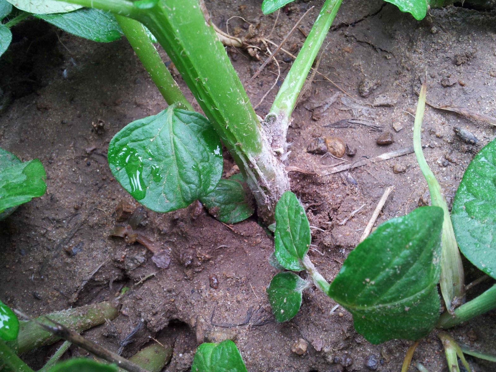 播种以后,受种薯带菌或因土壤中病菌侵染,幼芽顶部出现褐色病斑,使生长点坏死,称为烂芽。芽条受害后会停止生长,或从芽条下部节上长出一个新芽条,造成不出苗或晚出苗。出现出苗不全、不齐、细弱等问题。在出苗前后,主要感染地下茎,使地下茎上出现点片状或环剥的褐色溃疡斑。同时使薯苗植株矮小或顶部丛生,严重的植株顶部叶片向上卷曲萎蔫,有时腋芽生长气生薯。中期茎基部表面产生灰白色菌丝层,易被擦掉,擦后下面组织生长正常。被感染的匍匐茎为淡红褐色斑,轻者虽能结薯,但长不大,重者不能结薯,匍匐茎乱长或死掉。受侵染的植株,根量减少,形成稀少的根条。在受侵染植株上所结块茎上,表面附着大小不一、形状不规则的、坚硬的、土壤颗粒状的黑褐色土疤。这些土疤是菌核休眠体,冲洗不掉,而土疤下边组织完好,称为黑痣病,成为翌年种薯带病菌源。