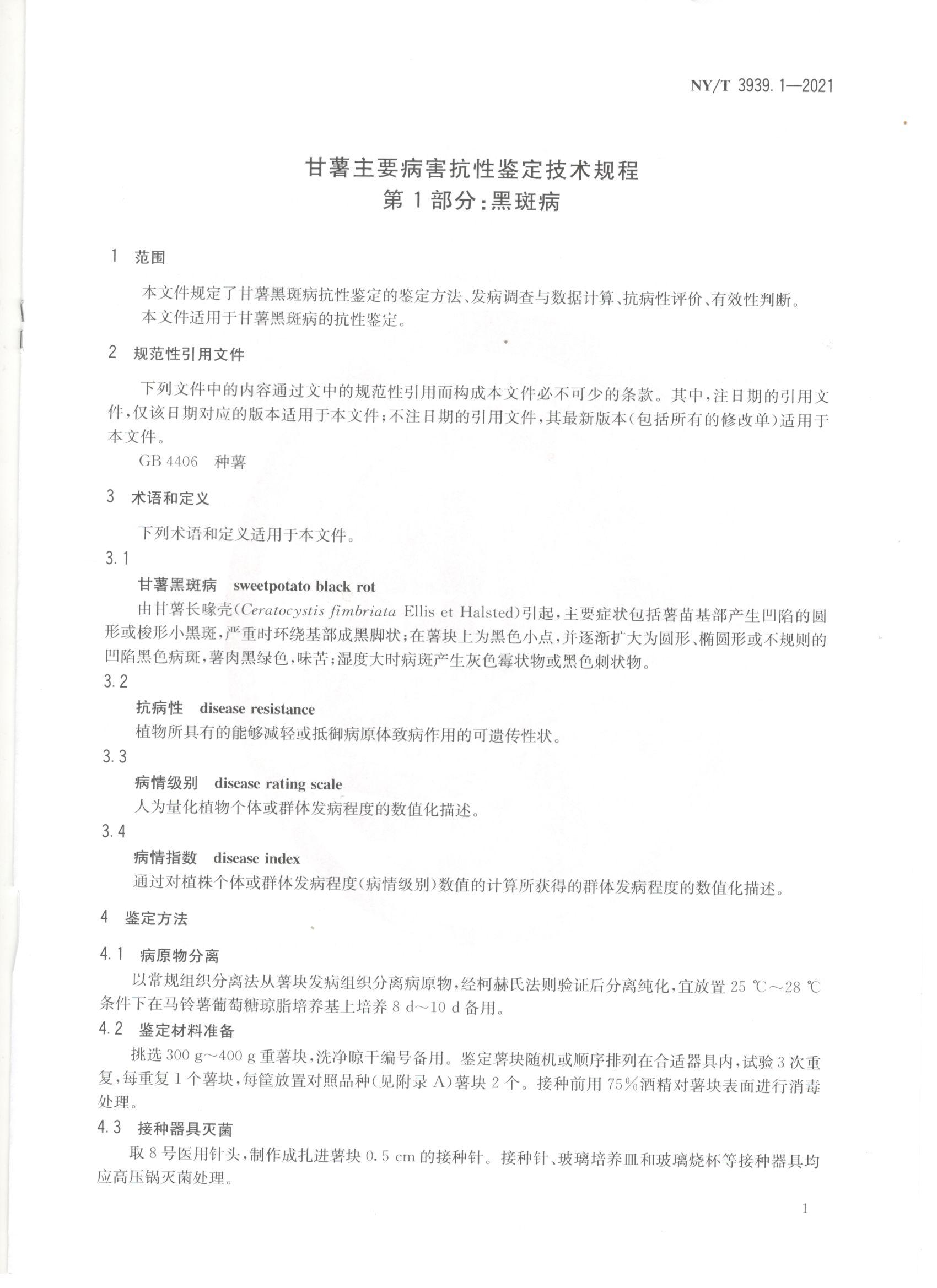 甘薯主要病害抗性鉴定技术规程 第1部分:黑斑病-国标